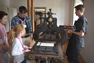 Pompallier Mission was next. This was named after Bishop Jean-Baptist Pompallier who, from 1839, established the first French Catholic mission headquarters to NZ and the Western Pacific on the site. The Printery/tannery is all that remains of a once crowded Mission site which has been restored to its original form and is NZ’s oldest surviving industrial building. There was a guided tour and my guide was Angel, a young English guy hailing from Purley, Surrey. He told me he’d been living in NZ on and off for 2 years and hoped to become a resident. He wasn’t the most knowledgeable nor fluent guide I’ve ever had but he did his best and can only improve. This was the place where Catholic texts were translated from Latin into Maori, printed and books bound with leather covers that were made here also. Apparently 40,000 were printed in 8 years. Angel guided us around the house starting with the preparation of animal skins ready for tanning, then the printing press (one by Gaveaux made in 1840), and the bookbinding process.
