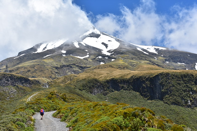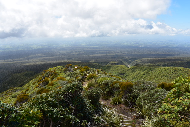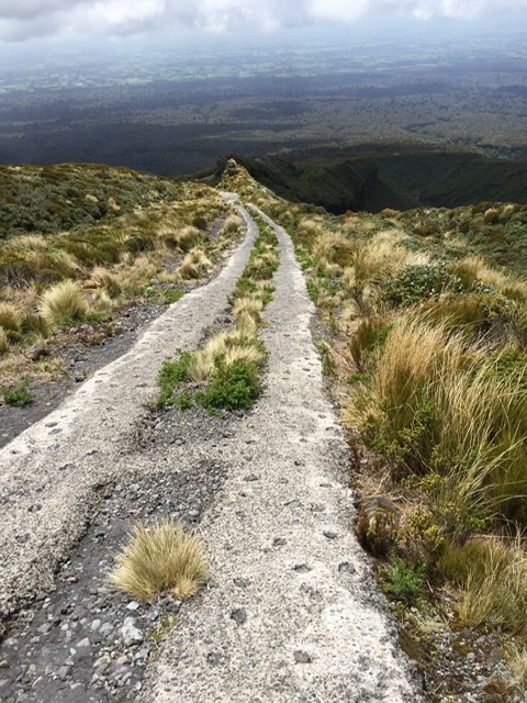 The Translator Rd is a very steep 4wd track, 3.5km in distance, initially a gravel road which was then cemented, but so steep at times that I walked on tiptoe. The views of the countryside and mountain made up for the hard walk. A few young men passed me and a few came down who’d been to the summit. One of those was a German man who said he’d set off at 5.15am and had got within 50m of the summit as it was icy. At the top of the track was an empty private hut with a bench outside where an English chap (who’d been living and working in Hamilton for 6 years) and a young French chap were eating their lunch, so I joined them and we made conversation. There was a tower (the Translator Tower) and I wondered why it was called that – something to do with radios. We were soon joined by an attractive young kiwi woman (although she had an odd accent) who’d walked the 3 day circuit on her own with a big pack. She’d slept one night on her own in a hut and one night when she was joined by a man. Brave, I thought. She was wearing, rather inappropriately, trainers so she did well to get to the top in those. It was obvious that the French guy took a shining to her.
