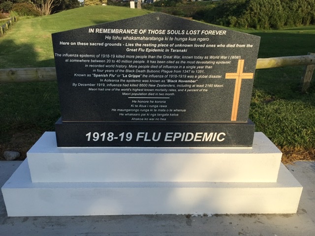 After settling in I went in search of dinner and walked down to the harbour front. However, on the way, I tripped on a wonky pavement and fell on all fours. Fortunately I just grazed my hands and knee (also made a hole in my favourite trousers) and thought I’d hurt my left hand, although knew nothing was broken. After catching my breath I continued walking and found a nice restaurant called ‘Gusto’ and had a huge plateful of linguine with vegetables (their vegetarian dish of the day) to carb load in anticipation of my planned walk the next day. On the way to the restaurant I spotted a memorial to the people who’d died of Spanish flu in Taranaki (district):