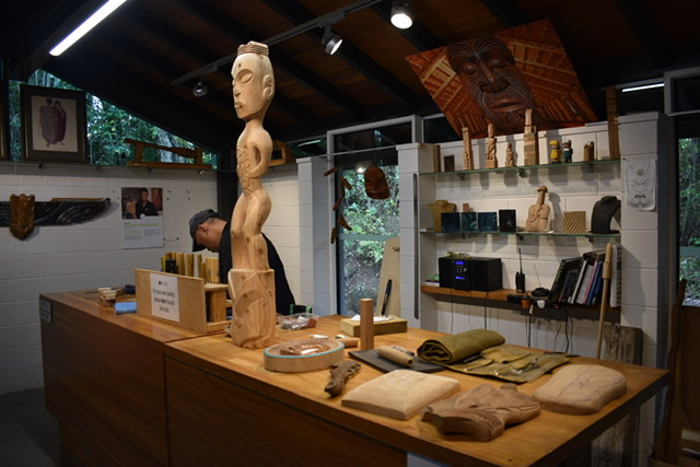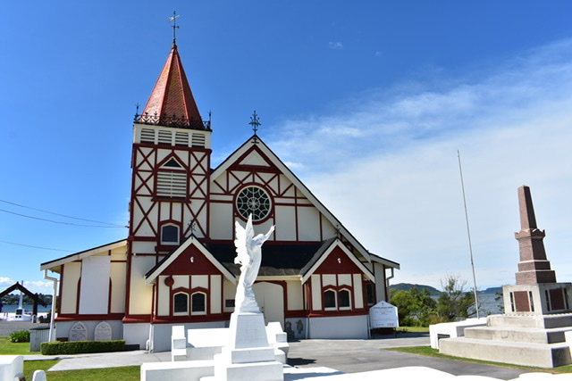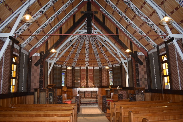 I’d booked to have a tour of the little Putiki Church (aka St. Paul’s Memorial Church) at 2pm and it turned out I was the only one. I nearly went yesterday but there was a tour group of 19 people booked and I’d have to have left early to meet Sue at the cinema. I got there a bit early and walked around the nearby Maori cemetery. The church is unremarkable from the outside but has a magnificent interior completely covered in Maori carvings and wall panels. My guide, Simon, didn’t worship there as said he’s a Roman Catholic but he was very knowledgeable about the meaning of the patterns of the panels and carvings: