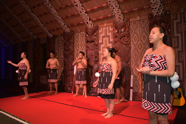 We were led in groups down to a stream to await a waka canoe rowed by men in typical Maori dress and chanting. Then we watched the unveiling of the hangi (food cooked underground – lamb, chicken and potatoes) and on to a very good performance including games, dances, music and explanation of various moves and instruments. Of course there was also a haka. Then we had a buffet meal. I was sitting on a table (we’d all been placed on particular tables) with some Indians from Singapore, one of whom was extremely obese and before she’d finished her main course went to get a huge pile of desserts, I guess because she was worried she might not get any! There was to be a visit to the stream and then to see some glow worms, but it was looking like that all might not start for a while so I decided to leave. I had enjoyed the experience.