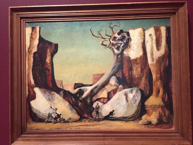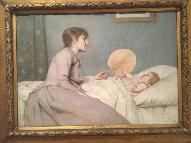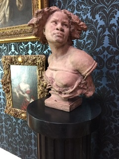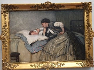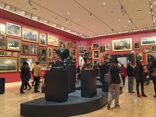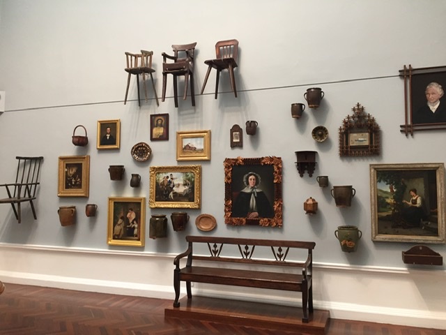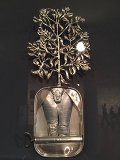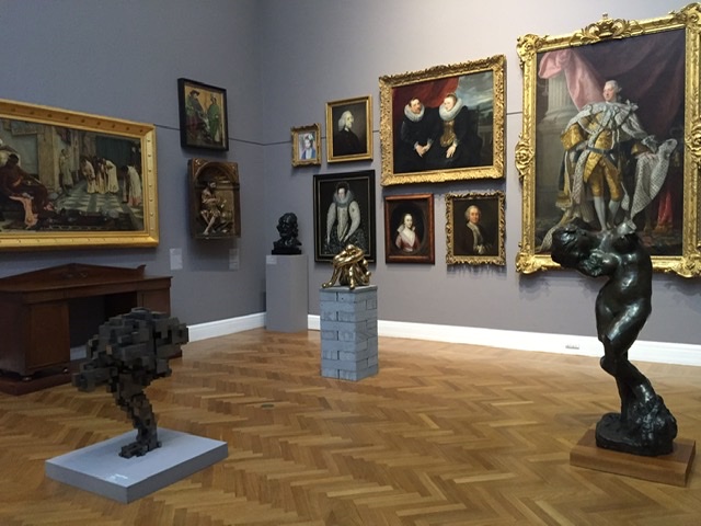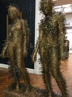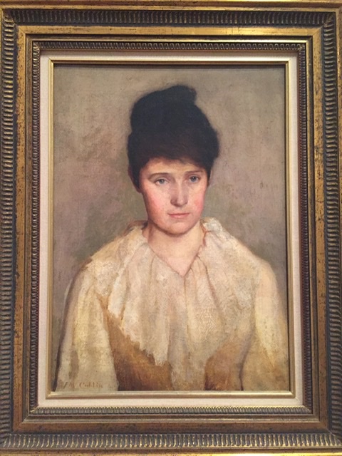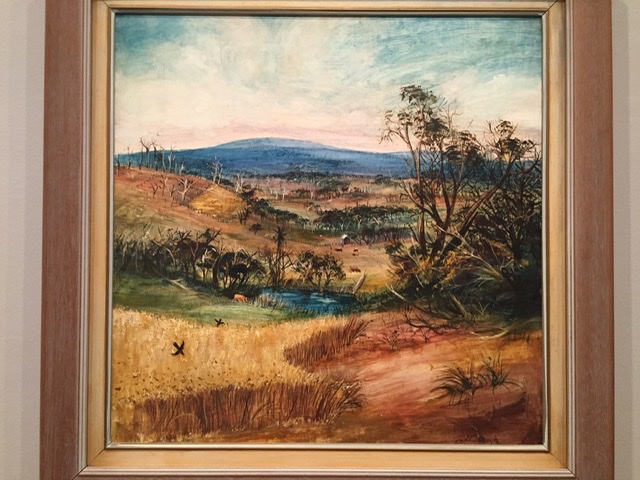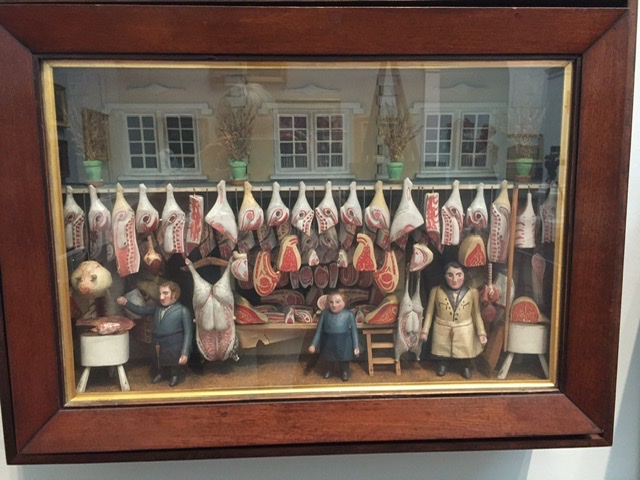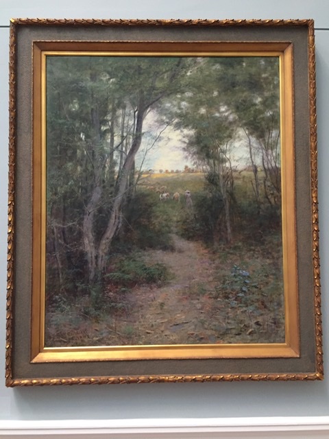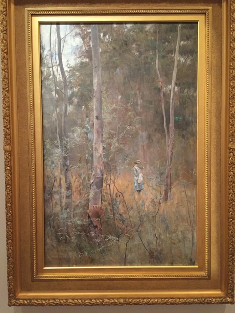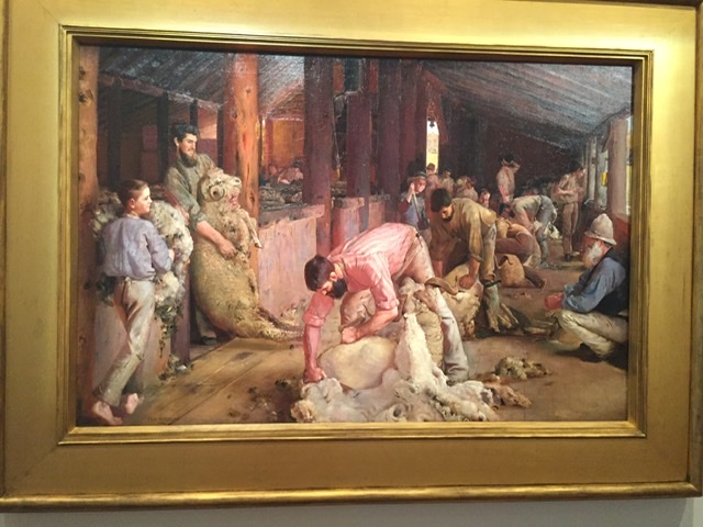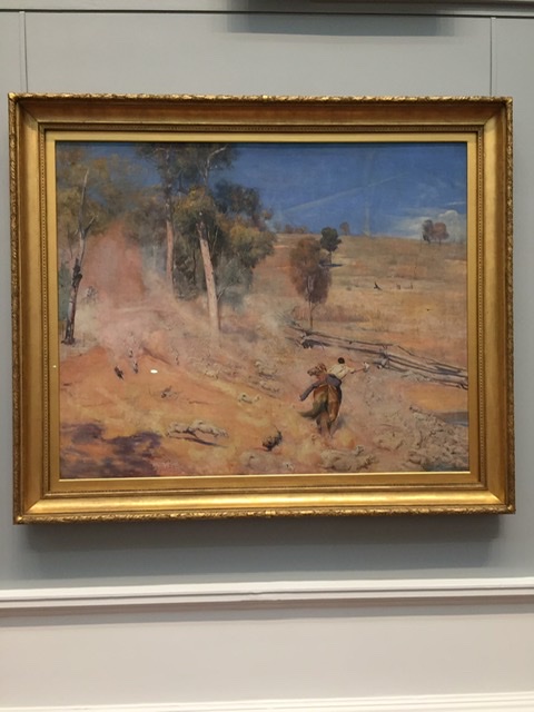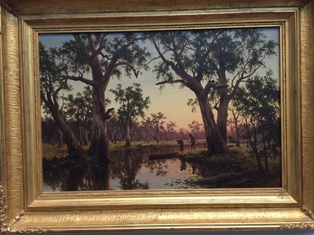 Top row,left: background sculpture: ‘Buck with Cigar, by Mark Quinn, born Britain 1964 and ‘Pierre de Wissant, monumental Nude’ by August Rodin; right: the frames of these interested me. Middle row left: interesting leatherworked frame, right: ‘A ti-tree glade’ by Frederick McCubbin; Bottom row, left: ‘A break away!’ by Tom Roberts, born Britain, died Oz, middle: ‘Butcher’s shop diorama’ c. 1850, England, right: ‘A billabong in the Goulburn Valley, Victoria, Australia’ by H.J. Johnstone (born Birmingham 1835, died London 1907)
