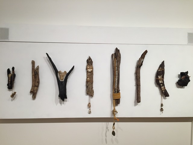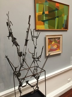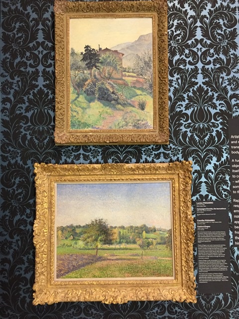 Top row, l-r: ‘Motherhood’ by George Coates, metal sculpture of found objects by Robert Klippel, ‘Quercus robur/oak’ by Fiona Hall; Middle row, l-r: ‘Capsicum annuum/chilli’ by Fiona Hall, ‘Hilda welcomed’ by Stanley Spencer, skeleton made of wood by ?; bottom L: ‘Why be born a slave?’ by Jean-Baptist’s Carpeux, r: ‘Twin-subjecter’ by Thomas Hirschhorn Top: ‘Campagne Orovida, the laurustinus’ by Lucien Pissarro, bottom: ‘Prairie a Eragny’ by Camille Pissarro