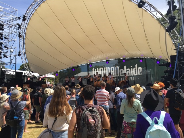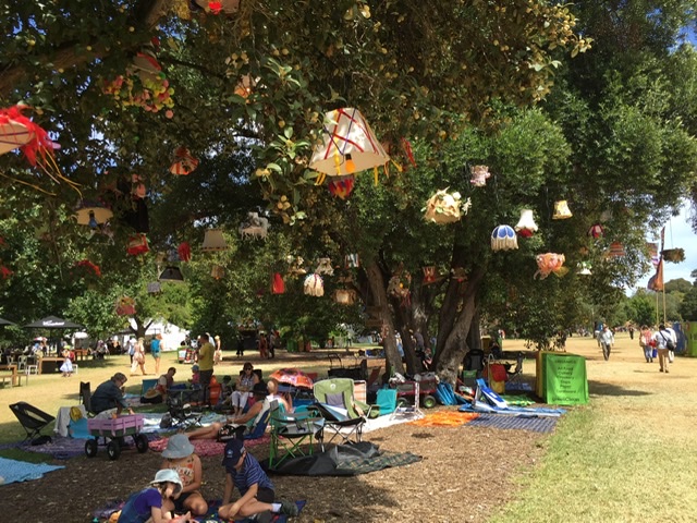 The events were held in Pioneer Women’s Memorial Garden, handily opposite Elder Park where the Tim Minchin concert was to be so I figured I could keep an eye on how the queue was going and join it early. There were two main stages for the literary events, west and east, in the open air under trees with some blue triangular canvas pieces strung across to give some shade. It was no problem getting a seat although I’d expected it would be given that it was all free but there’s so much going on (this, the fringe, the arts festival and next weekend Womadelaide) that I expect people have lots of choices. The locals call this period in Adelaide ‘Mad March’.