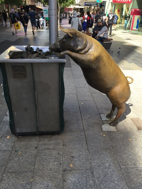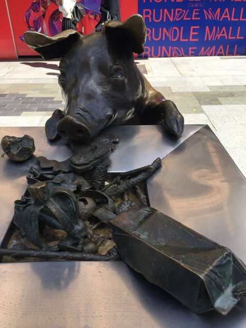 I went off to the local supermarket and a good fruit and veg shop to get some supplies. Not all Airbnb hosts will allow use of their kitchen to cook, sometimes just the microwave, but Deb does, although I decided to keep things easy with salads and some ready made meals. As it was my first day in Adelaide I walked into the centre in order to orientate myself. It took about an hour and was quite pleasant as the temperature wasn’t as high as originally forecast. I picked up brochures for all the festivals (Arts Festival – that I was turned down for as a volunteer, Fringe Festival which had already started, Writers’ Week – all of the events being free and Womadelaide). I popped to the tourist information office and got a Metrocard for the transport system. Along Randle Mall I saw this charming statue, which belonged to a group of pigs, called ‘A Day Out’ completed in 1999 by the artist Marguerite Derricourt: