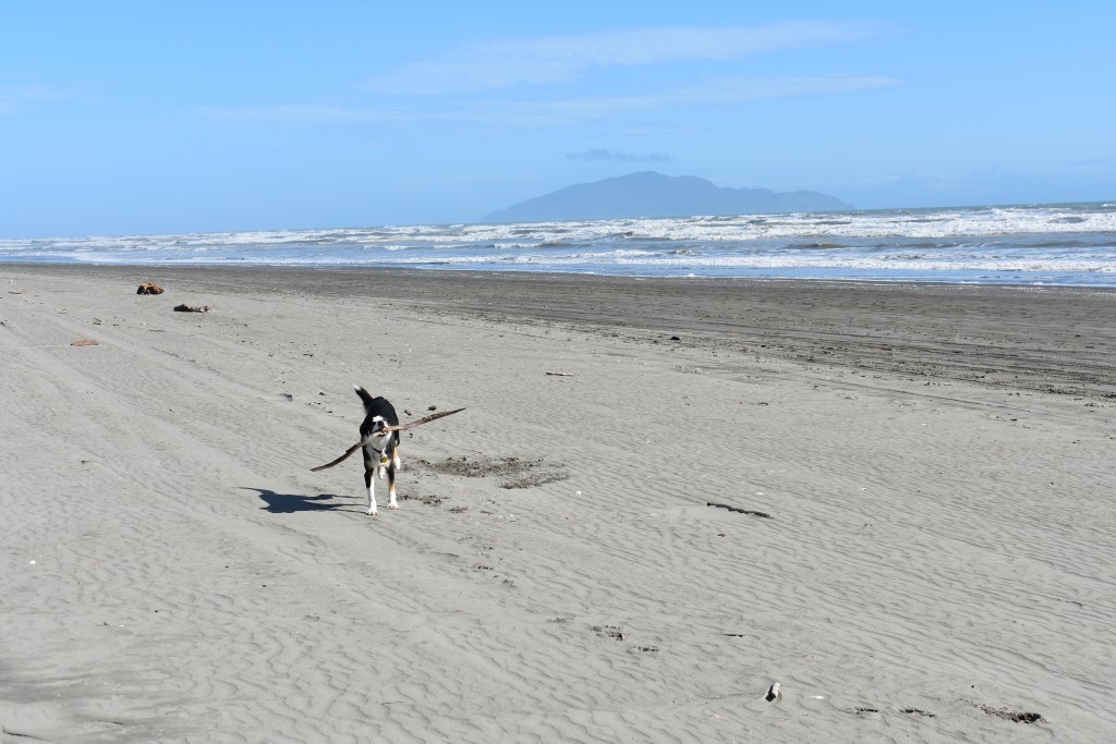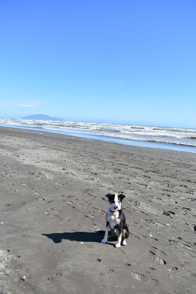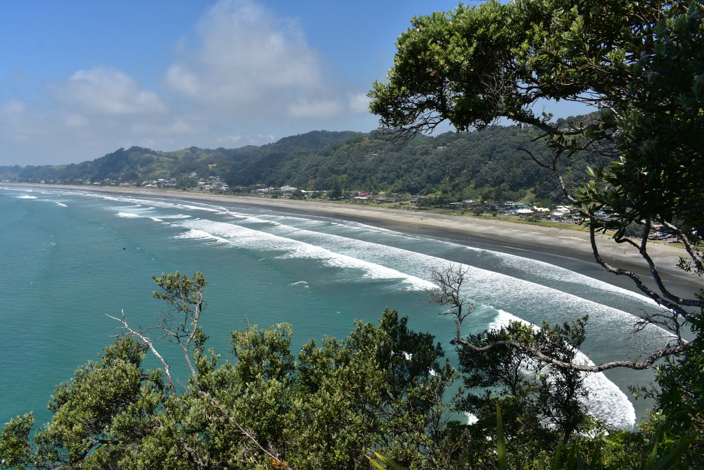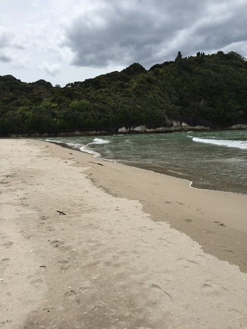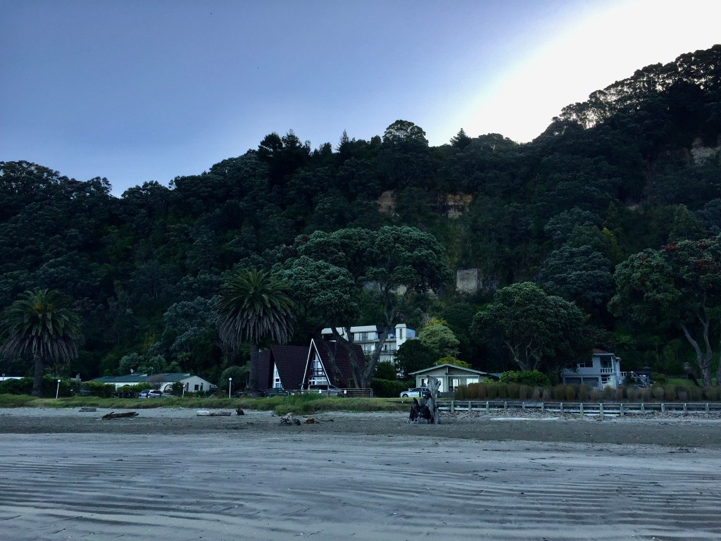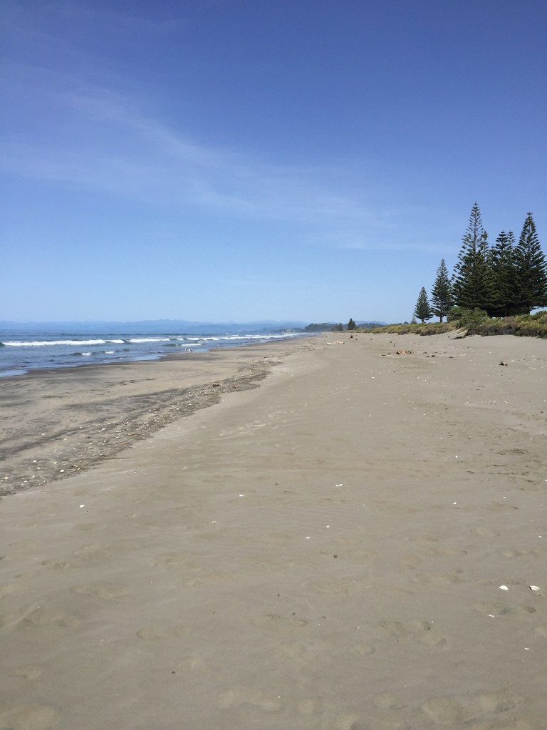 After dropping off my bags and filling the fridge I went to investigate the beach, about 200 yards from the studio. I’d noticed signs saying it was voted NZ’s most loved beach. If that’s true I could see why as it offers ‘the walker, bather, surfie or fisherman 11 kms of uninterrupted white Pacific beach sand’. It was pretty empty, being working hours still, but there was a father with four young children, teaching and encouraging the older two to surf while their mum took videos and photos. It was lovely to see.