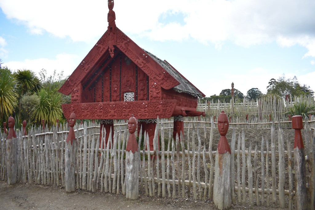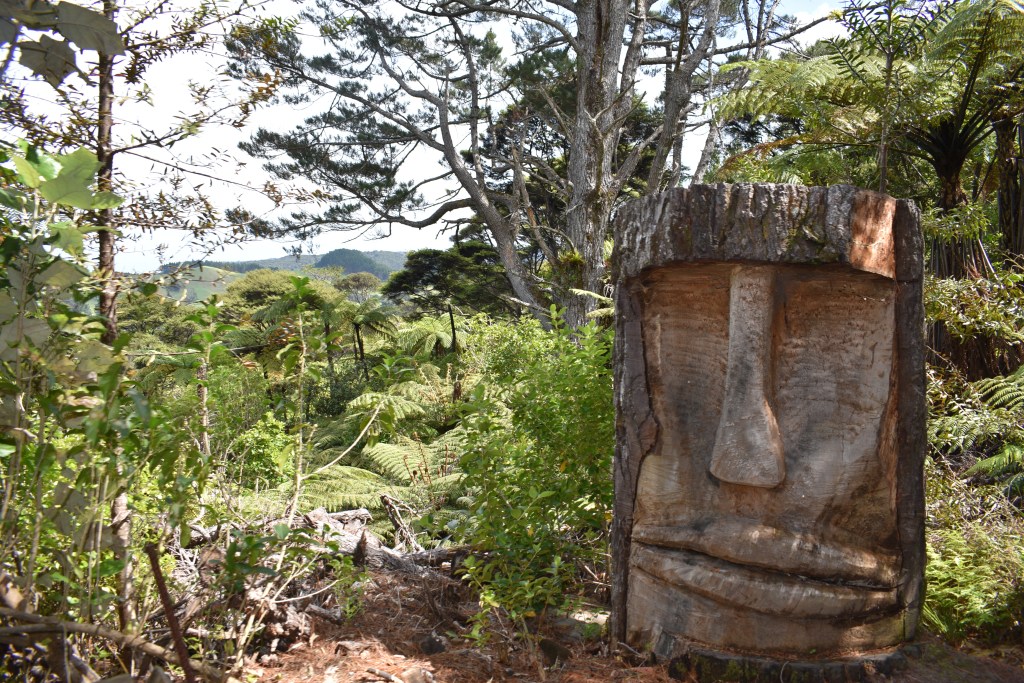 Burial trees are highly sacred to the Maori people. Exhuming bones of the distinguished dead was an ancient practice conducted in accordance with ritual. Sometimes slaves were sacrificed to add prestige to the occasion. The bones were scraped clean then painted with oxide of iron (ochre) and hidden in a cave or hollow tree where they would not be found by tribal enemies. If a person desecrated a burial tree (or cave) the offender’s death would follow. This particular burial tree is a puriri tree (hard and durable timber) is called Taketakerau and is guarded by two wooden statues.