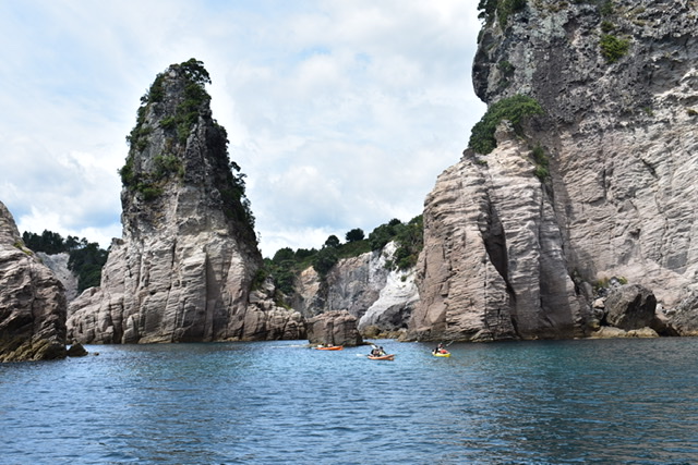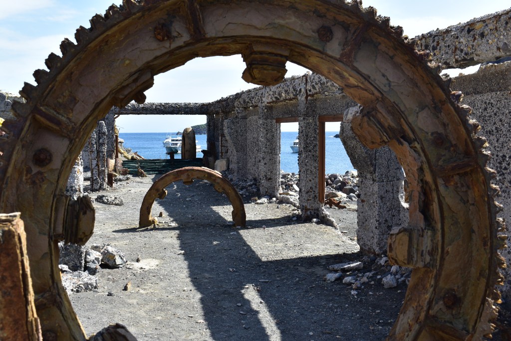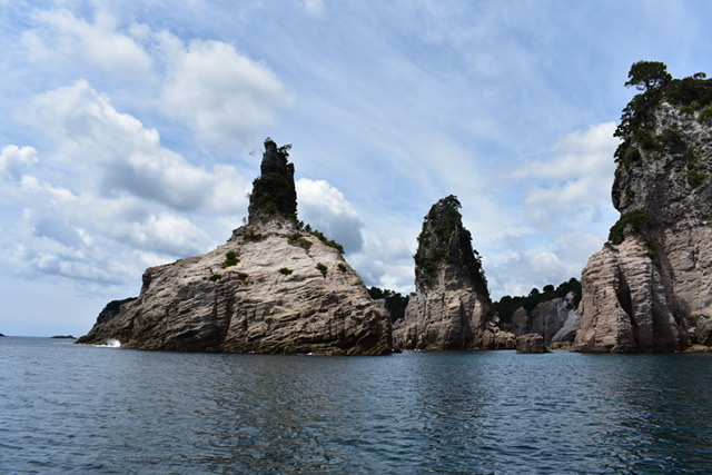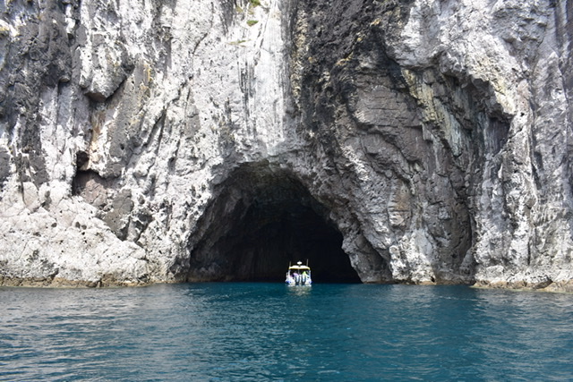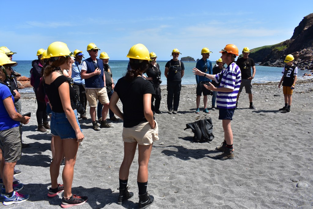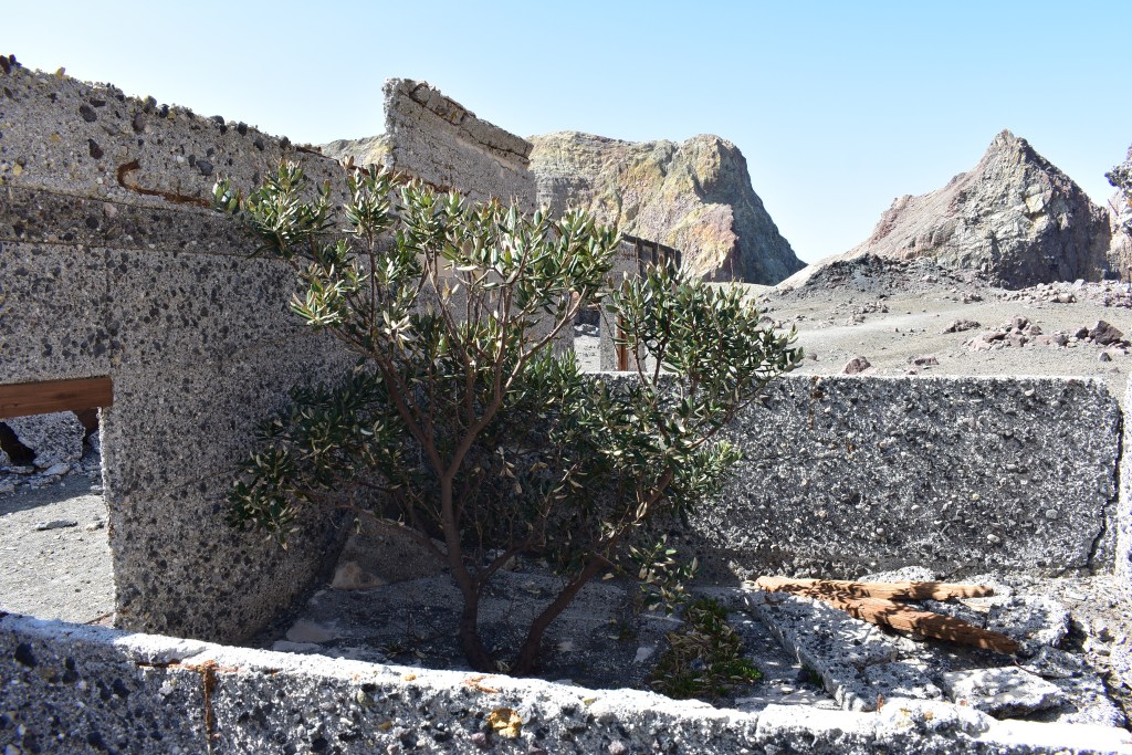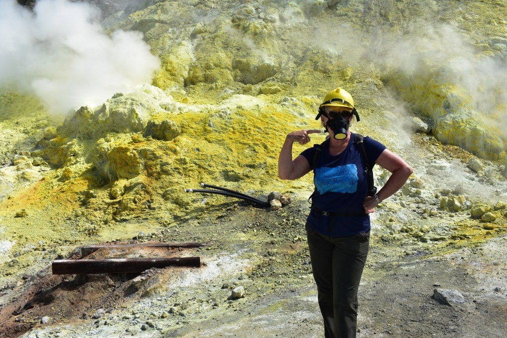 On arriving at the island we were all given a life jacket, hard yellow hat and gas mask and ferried in groups in a dinghy to the jetty. We spent about an hour or so being guided around a small part of the island and told to use our masks when necessary. It was amazing to see the steam and smell the sulphur. There were the remains of a factory and walls of buildings that housed men who had worked on the island collecting the sulphur, between 1923 and 1933. Apparently these men earnt twice as much as the gold miners in Waihi. Despite the harsh conditions there’s a thriving gannet colony and I was surprised to see grass and trees in places. We were told to wear the gas mask as the sulphur could make us cough and give us sore throats and that constant saliva also helped, so we were offered boiled sweets to increase our saliva! We all managed to get off the island without incident.
