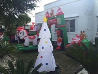 On the way back I stopped to chat to a man who’d blown up various inflatable Christmas figures in his garden (that yesterday were lying on the ground) and was busily putting up lights. I asked if I could take a picture as it seemed so strange to me having Christmas in the summer and asked when he’d switch the lights on. He said there would be a practice run tonight.