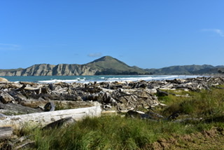 After my chat and visit to the lighthouse with some wonderful views, it was back to the main route and a drive around the east side of the Cape. Amazing how different the scenery was, not half as attractive weirdly as the west side. I stopped at Cafe 35 along the route as it had been recommended, for tea and scone, and then got to Tolaga Bay at 4pm. My Airbnb here was a nice little cabin, no one was around but the door was unlocked with key on the inside. I dropped off my things and went straight out to explore the beach, which was disappointingly full of driftwood: