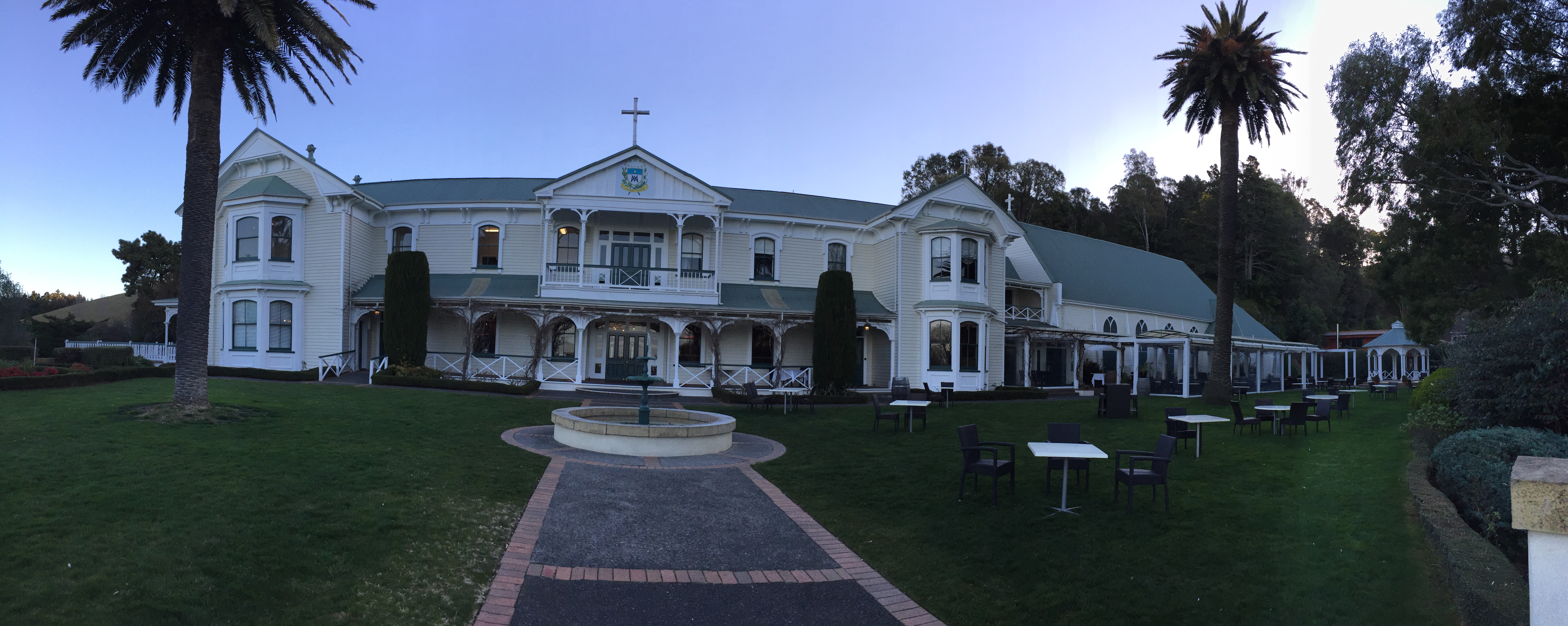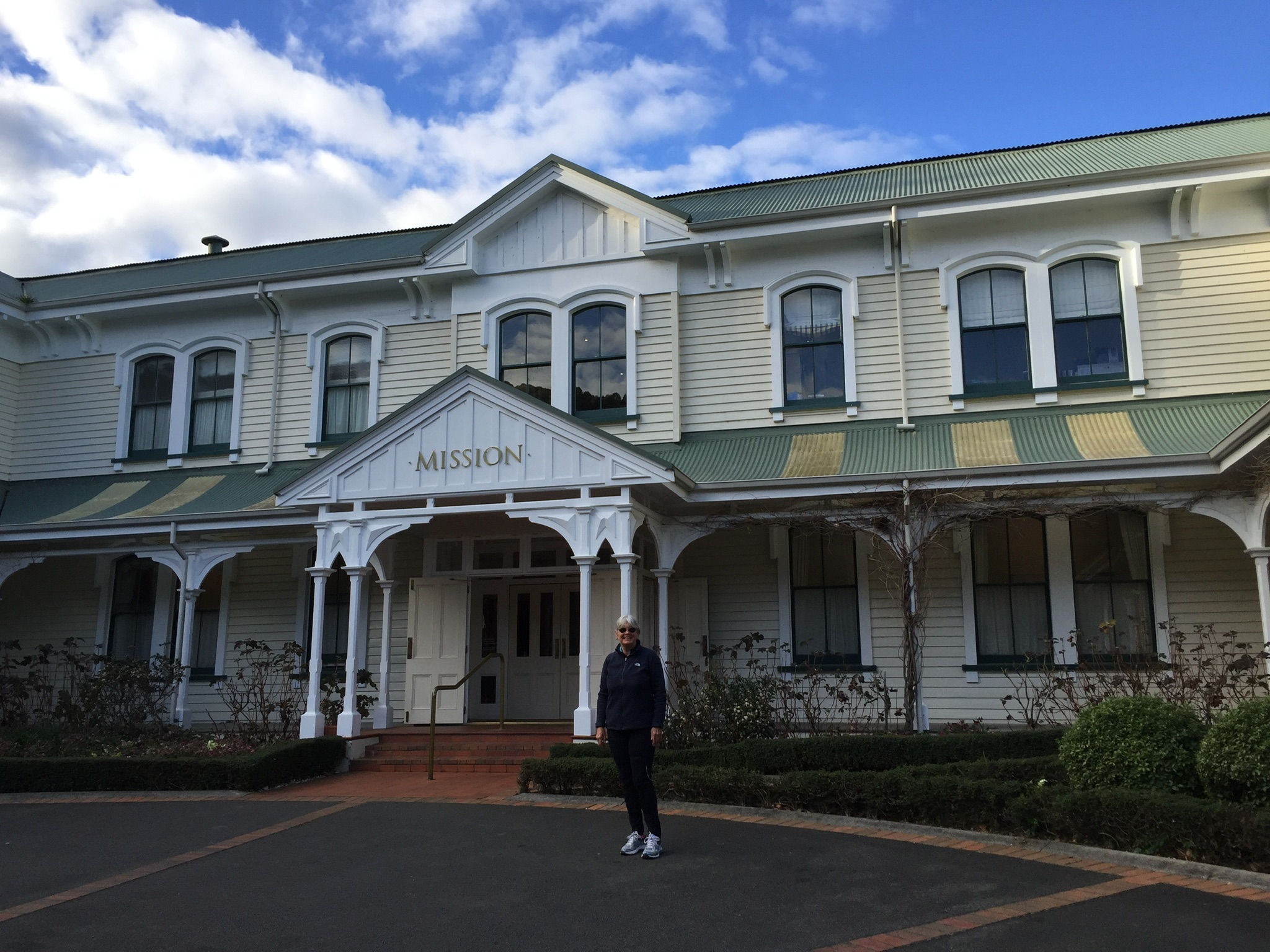 We had planned to go to two wineries that were next to each other but, in the end, only had time for one, Mission Estate, which I suggested as I’d drunk some of their wine. The building reminded me of a monastery in the Spanish style. The Estate was established in 1851 by the French Marist religious order and is NZ’s oldest winery with a well respected reputation at home and abroad. We paid just $6 for even more generous samples of about 7 wines and were given a glass in a box, which we both ended up giving to Peter to add to his collection as it wasn’t practical for us to carry them in our luggage.